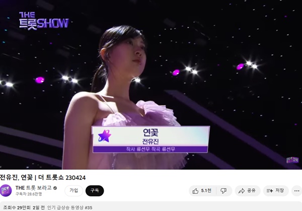 27일 관계자에 따르면 전유진이 지난 24일 방송된 SBS FiL, SBS M ‘더 트롯쇼’에 출연해 가진 신곡 ‘연꽃’ 무대 영상이 유튜브 공개 이틀 만에 28만 조회수를 훌쩍 넘어섰다. 이 영상은 27일 오후 7시 30분 현재 29만2144회를 기록 중이다.