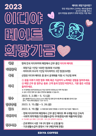 (서울=NSP통신) 이복현 기자 = 이디야커피가 이달 12일까지 2023년 ‘이디야 메이트 희망기금’ 지원자를 모집한다.