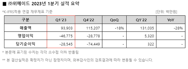 (서울=NSP통신) 이복현 기자 = 위메이드(대표 장현국)가 9일 2023년 1분기 실적을 발표했다.