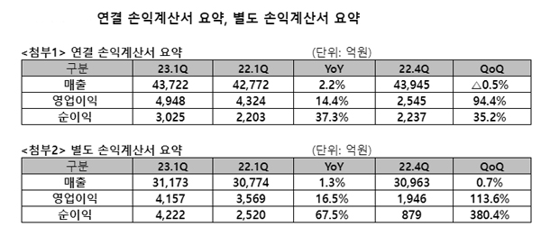 SKT는 별도 재무제표 기준 2023년 1분기 매출 3조1173억원, 영업이익 4157억원을 기록하며 전년 동기 대비 각각 1.3%, 16.5% 성장했다.