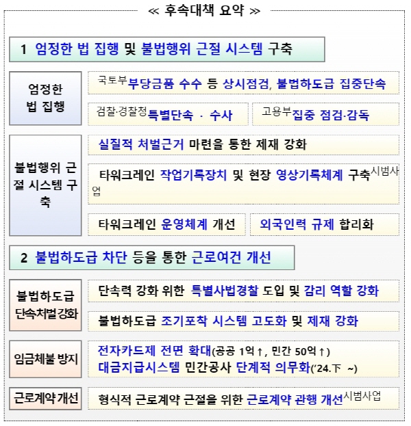 이에 당정은 항구적인 불법행위 근절을 위한 제도적 기반 구축을 위해 월례비 수수, 공사방해 등 처벌근거가 모호한 부당행위에 대한 제재기반을 강화하기로 했다. 또 데이터에 기초한 투명한 노무 및 안전 관리를 위해 건설현장 원격 모니터링체계 및 타워크레인 스마트 작업기록장치를 도입하기로 했다.