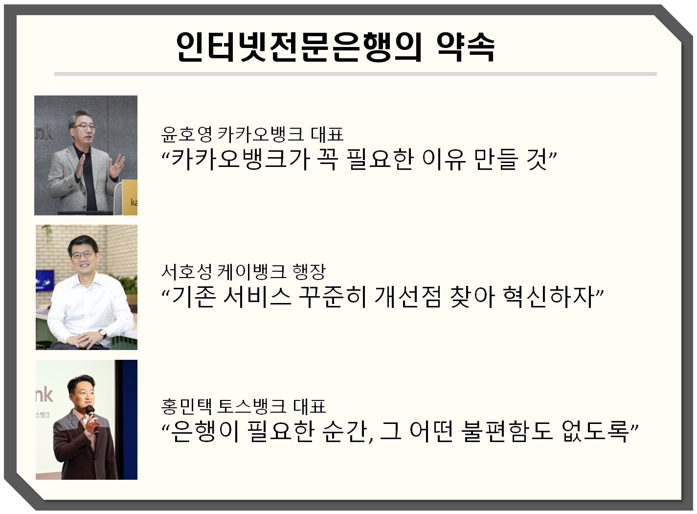 서호성 케이뱅크 행장 역시 올해 신년사에서 “새로운 상품과 서비스 시도에도 주저하지 말자”며 “기존 서비스는 꾸준히 개선점을 찾아 혁신하자”고 강조했다. 토스뱅크 역시 “고객을 먼저 생각하고 고객과 함께 성장한다”며 “은행이 필요한 순간 그 어떤 불편함도 느끼지 않도록 하겠다”는 문구를 내걸고 있다.
