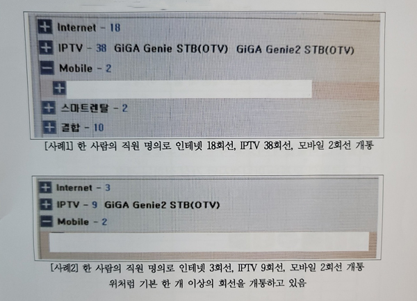 구체적으로 한 사람의 직원 명의로 인터넷 18회선, IPTV 38회선, 모바일 2회선 개통 사례를 공개했다. 또 다른 직원 명의로 인터넷 3회선, IPTV 9회선, 모바일 2회선 개통이 된 이미지를 공개했다.