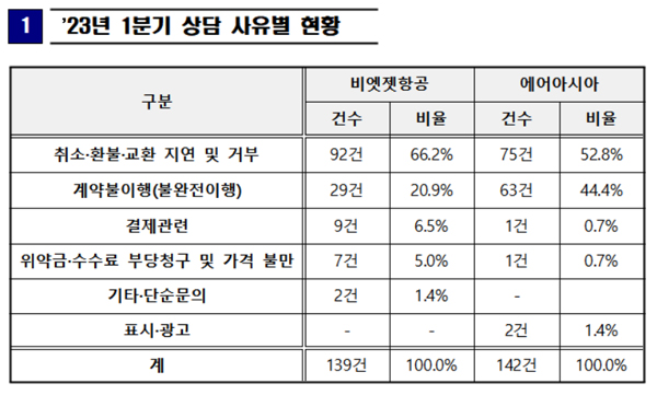 에어아시아(국내 취항 에어아시아엑스, 필리핀에어아시아, 타이에어아시아엑스) 관련 상담 142건의 경우, ‘취소·환불·교환 지연 및 거부(75건, 52.8%)’와 ‘계약불이행(63건, 44.4%)’이 대부분을 차지했다.