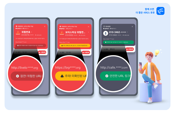 후후는 앱을 설치한 고객에게 URL 이 포함된 문자메시지가 도착하면 해당 URL 을 분석한 결과를 ‘위험, 의심, 안전’의 세 가지 유형으로 알림창에 실시간 제공한다. 예를 들어 “위험한 URL이 포함돼 있습니다”와 같은 직관적인 메시지로 알려준다.