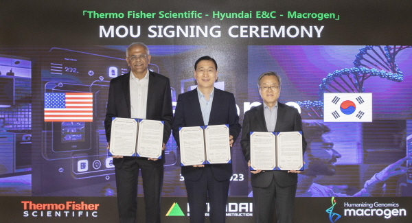 현대건설은 지난달 31일 서울 종로구 계동에 위치한 현대건설 본사에서 생명공학 분야 세계 기업 미국 써모 피셔 사이언티픽(Thermo Fisher Scientific, 이하 써모 피셔), 대한민국 유전자 분석·검사 서비스 기업 마크로젠과 함께 유전자 분석 기반의 미래 건강주택 개발을 위한 3자간 전략적 업무협약(MOU)을 체결했다고 1일 밝혔다.