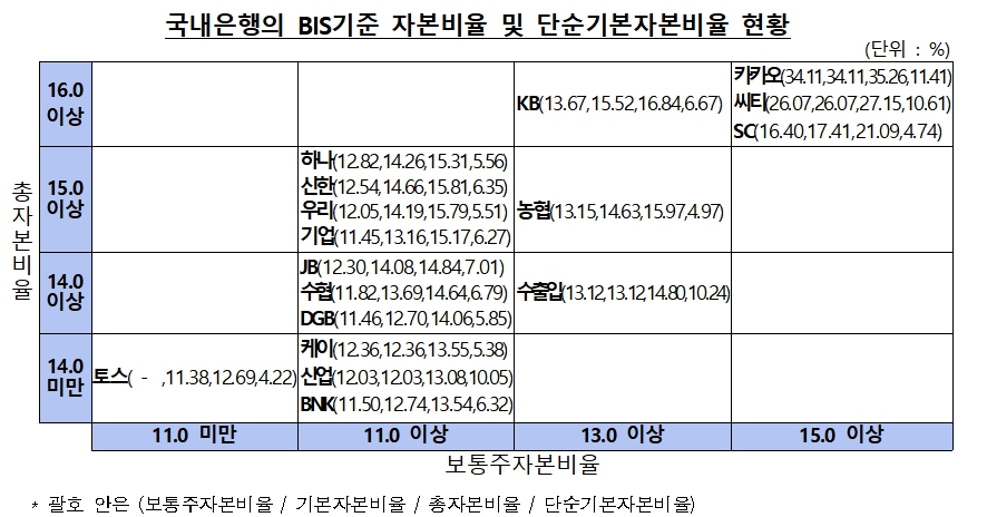 상대적으로 위험가중자산이 크게 감소하거나 자본 증가폭이 큰 11개 은행(KB·우리·DGB·JB·농협·SC·씨티·기업·수출입·수협·토스)은 전분기말 대비 자본비율이 상승했다.