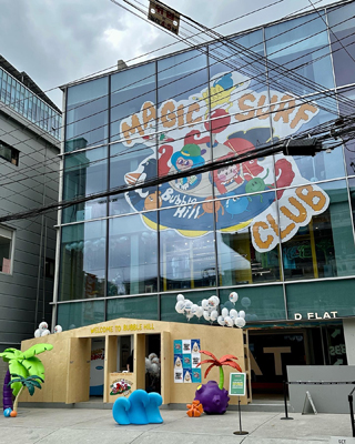 팝업스토어 1층은 우주선을 타고 등장한 배찌, 다오, 펭키 캐릭터 그래픽과 함께 마치 매직 서프 클럽 행성에 온 듯한 느낌을 선사하는 야자수, 파도, 물폭탄 등의 대형 조형물로 꾸며졌으며, 컬래버 그래픽 테마의 디저트를 맛볼 수 있는 카페 공간이 준비됐다.
