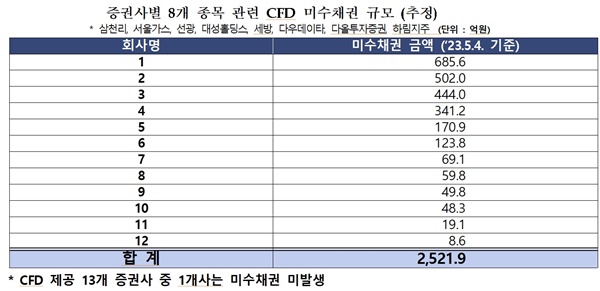 한편 국회 정무위원회 소속 이 의원이 8일, 금융감독원에서 제출받은 ‘삼천리, 서울가스, 선광, 대성홀딩스, 세방, 다우데이타, 다올투자증권, 하림지주 등 증권사별 8개 종목 관련 CFD 미수채권 규모(추정)’자료에 따르면 13개 증권사 CFD 미수채권 규모는 총 2521억 원으로 가장 많은 규모의 CFD 미수 채권을 보유하고 있는 증권사는 685억 원, 가장 적은 미수채권을 보유하고 있는 증권사는 8억 원으로 추정됐다.