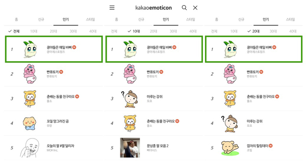 지난 7일 선보인 쿵야들은 매일 바뻐 이모티콘은 출시 직후 ‘많이 선물하는 이모티콘’ 카테고리 1위를 달성한데 이어 하루만에 전체 인기 순위에서 1위에 올랐다. 연령별 인기 순위에서도 10대와 20대 소비자로부터 가장 많은 선택을 받았다.
