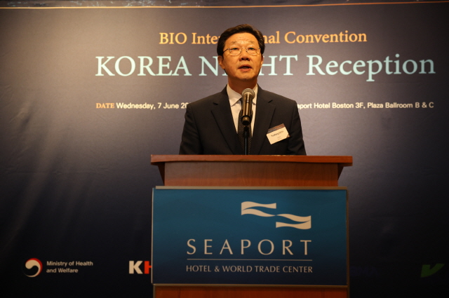 NSP통신-7일(현지시간) 미국 보스턴 씨포트 호텔에서 열린 코리아 나잇 리셉션에서 노연홍 한국제약바이오협회 회장이 인사말을 하고 있다. (사진 = 한국제약바이오협회)