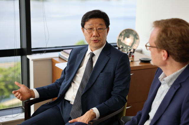 NSP통신-9일(현지시간) 미국 보스턴 MIT ILP에서 노연홍 한국제약바이오협회 회장(왼쪽)이 존 로버트 MIT ILP 총괄이사와 대화를 나누고 있다. (사진 = 한국제약바이오협회)