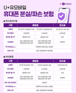 이동통신 3사의 휴대폰 보험이 보통 6~7000대로 구성돼 있는 것에 반해 U+유모바일의 휴대폰 보험 상품은 월 보험료 2~3000원대로 저렴한 것이 특징이다.