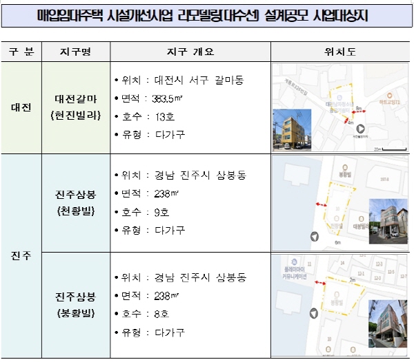 특히 이번 리모델링(대수선)사업은 매입임대주택의 주거환경을 근본적으로 향상시키기 위해 단위 가구를 재구성하는 대수선 공사를 실시하는 사업이다. 시범사업은 매입임대주택의 디자인 품격 향상을 위한 기준 제시를 위해 설계공모 방식으로 추진된다.