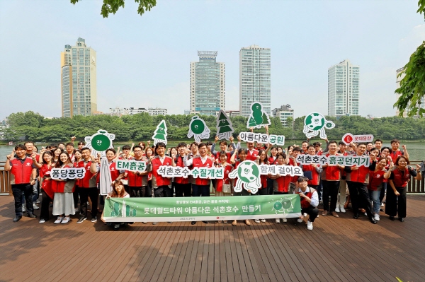 석촌호수의 수질 개선과 아름다운 생태 환경 조성을 위해 마련된 이번 행사는 롯데물산 임직원 150여 명이 참여해 EM흙공 1500개를 석촌호수에 던졌다.