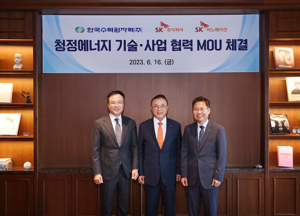 (서울=NSP통신) 이복현 기자 = SK가 16일 서울 종로구 SK서린빌딩에서 SK이노베이션, 한국수력원자력(이하 한수원)과 ‘청정 에너지 사업 협력을 위한 전략적 업무협약(MOU)’을 체결했다.