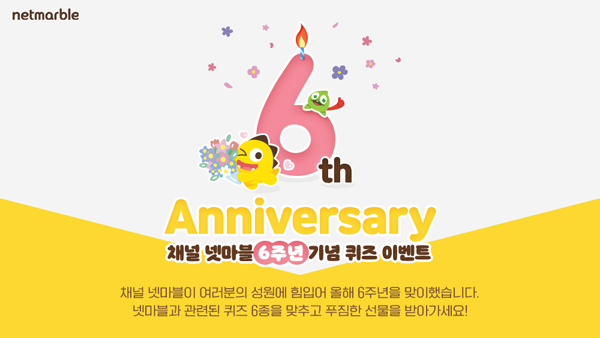 (서울=NSP통신) 이복현 기자 = 넷마블(대표 권영식, 도기욱)의 자체 브랜드 미디어 채널 넷마블이 출범 6주년을 맞이해 오는 30일까지 ‘채널 넷마블 6주년 기념 퀴즈 이벤트’를 진행한다.