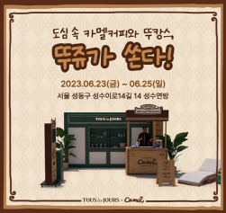 이번 이벤트는 성수동의 복합문화공간 ‘성수연방’에서 23일~25일까지 3일간 오후 12시부터 진행된다. 뚜레쥬르 앱 다운로드 및 신규 가입 시 카멜 컬래버 신제품 ‘카멜 콜드브루’와 ‘카멜 쇼콜라 타르트’, 그리고 더위를 식힐 수 있는 시원한 부채를 함께 제공한다. 또한 이벤트 포토존에서 인증샷 촬영 후 개인 인스타그램에 업로드하면 카멜 비치타월, 카멜 콜드브루(원액), 앱 전용 할인쿠폰 등 100% 경품을 증정하는 뽑기 이벤트도 참여할 수 있다.