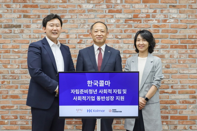 한국콜마가 자립준비청년을 지원하는 행사를 갖고 기념사진을 촬영하고 있다. (왼쪽부터)고대현 소이프스튜디오 대표, 최현규 한국콜마 대표, 하정은 재단법인 밴드 이사장 (사진 = 한국콜마)