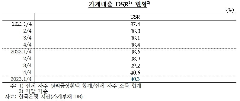DSR은 2021년 1분기 37.4%를 기록한 이후 매분기마다 상승해 왔으며 2022년 4분기 40%를 넘어선 이후에도 계속 오르고 있다.