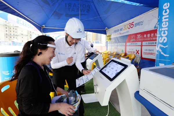 현장에 설치된 체험존에서는 근로자들이 열화상 카메라로 체온을 측정하고 설문조사를 통해 자가진단 및 스트레스 체크를 진행했다. 이어 아이스튜브 체험, 이온음료를 마시며 휴식시간을 갖는 쿨다운 프로그램에 참여했다.