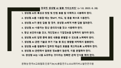 이번 가이드라인은 모두 10가지로 이뤄졌으며, 이를 잘 따르면 챗GPT 등 생성형 AI 사용에서 생기는 많은 문제점이 해소되며, 생성형 AI 사용의 긍정적인 효과로 우리나라가 AI강국이 되는 데도 많은 도움이 될 것으로 생각된다.
