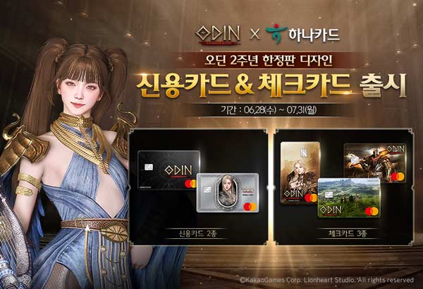 이번 한정판 카드는 7월 31일까지 발급 가능하며 오딘의 서비스 2주년을 맞이해 이용자들에게 맞춤형 혜택 및 새로운 즐거움 제공을 목적으로 제작됐다. 카드 디자인은 게임 내 인기 캐릭터인 소서리스, 오딘의 첫 번째 월드인 미드가르드 등으로 구성됐다.