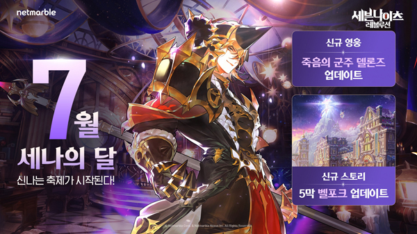 넷마블은 세나의 달을 기념해 오는 18일까지 매일 달라지는 7개의 미션을 완료하고 7개의 보상을 획득할 수 있는 이벤트도 진행한다. 또 오는 8월 1일까지 ‘델론즈 소환/성장 이벤트’도 함께 실시한다.