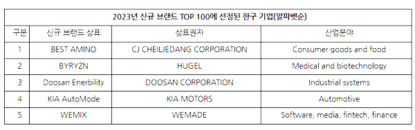국내에서는 ▲CJ제일제당의 베스트 아미노(BEST AMINO), ▲휴젤(HUGEL)의 바이리즌(BYRYZN), ▲두산의 두산 에너빌리티, ▲기아의 기아 오토모드, ▲위메이드의 위믹스(WEMIX) 등 5개가 신규 브랜드로 등재됐다.