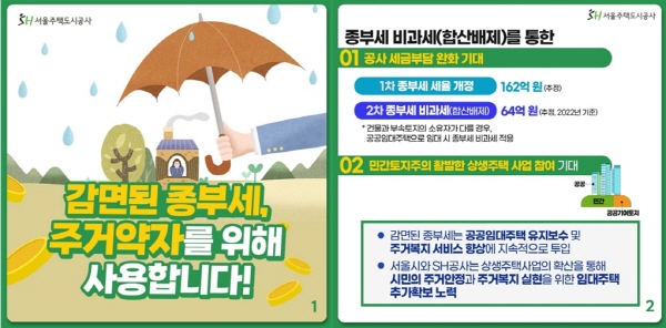 이 같은 정부 조치로 SH공사는 64억 원 가량(2022년 납부액)의 종부세 부담이 줄어들 것으로 예상하고 있다.