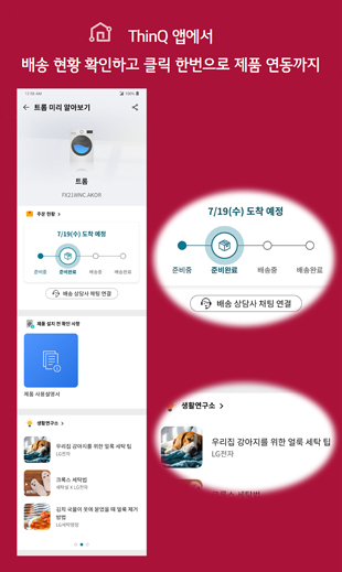 온보딩 서비스를 이용하면 구매 후 배송 준비부터 발송, 이동, 도착 예정일 등을 실시간으로 LG 씽큐 앱에서 확인할 수 있다. 상담원과의 라이브 채팅 기능을 통해 배송과 관련한 문의 상담, 배송일 변경 등도 가능하다.