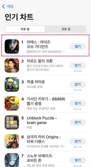 카카오게임즈, 아레스 애플 마켓 인기순위 1위