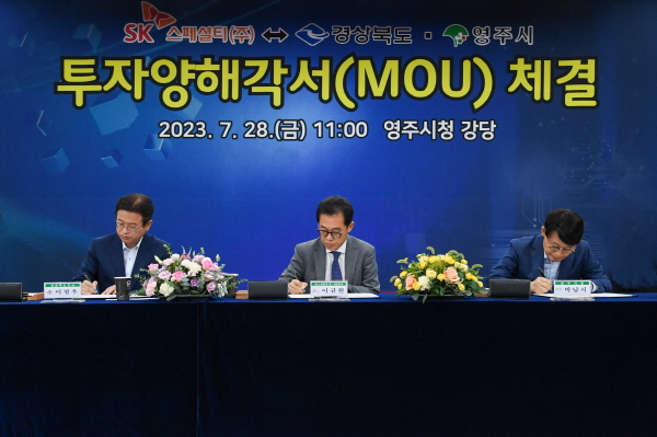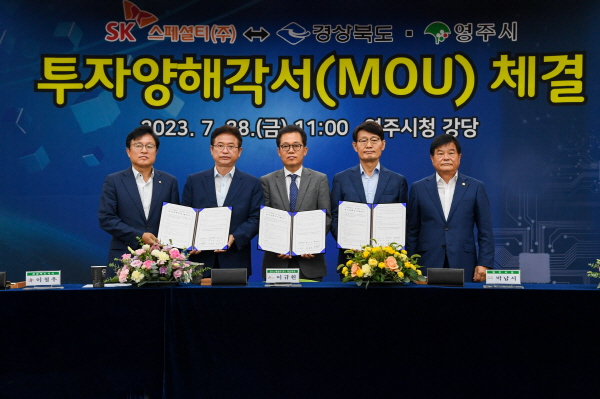 경상북도와 영주시는 28일 오전 11시 SK스페셜티와 영주시청 강당에서 이철우 경상북도지사, 박남서 영주시장, 박형수 국회의원, 심재연 영주시의회 의장, 이규원 SK스페셜티 대표이사가 참석한 가운데 신규 산업단지 조성 및 반도체/디스플레이용 소재 제조 공장 신·증설 투자에 대한 투자양해각서를 체결했다.