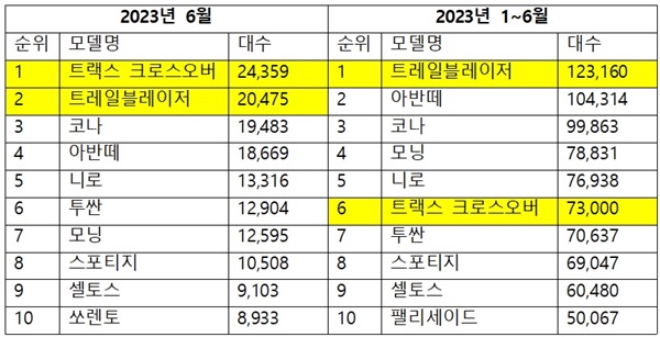 2023년 상반기 누적 수출 순위에서도 트랙스 크로스오버와 트레일블레이저는 눈부신 활약을 펼치고 있다.