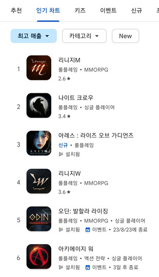 한편 29일 현재 구글 매출 순위 1위는 리니지M, 2위는 나이트 크로우를 차지하고 있으며, 리니지W는 4위로 밀려났다.