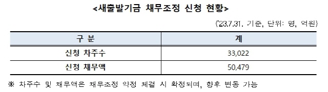 한국자산관리공사(캠코)는 새출발기금 채무조정 신청에 대해 7월 31일 기준 채무조정 신청 3만3022명, 채무액은 5조479억원 규모라고 밝혔다.