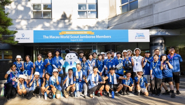 NSP통신-수원에 위치한 대우건설 인재경영원에 도착한 마카오 잼버리 참가자들이 기념촬영을 하고 있다. (사진 = 대우건설)