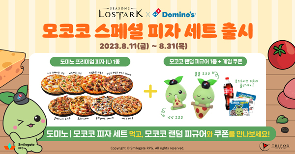 오는 8월 11일부터 8월 31일까지 진행되는 이번 콜라보 기간 동안에는 프리미엄 피자 라지(L) 사이즈 주문시 모코코 피규어와 로스트아크 스페셜 쿠폰, 콜라 1.25L를 함께 받을 수 있는 모코코 스페셜 피자 세트가 출시된다.