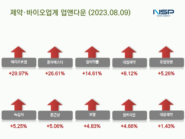이 밖에 JW중외제약(+12.80%) SK바이오팜(+8.41%) 대원제약(+8.12%) 영진약품(+6.15%) 동아쏘시오홀딩스(+5.76%) 유한양행(+5.26%) 녹십자(+5.25%) 종근당(+5.06%) 경보제약(+4.97%) 더메디팜(+4.90%) 보령(+4.83%) 삼일제약(+4.68%) 셀트리온(+4.66%) SK바이오사이언스(+4.58%) 한독(+4.31%) 광동제약(+4.30%) 제일파마홀딩스(+4.22%) 일양약품(+3.52%) 유유제약(+2.58%) 대웅제약(+1.43%) 삼성바이오로직스(+1.01%) 등이 상승했다.