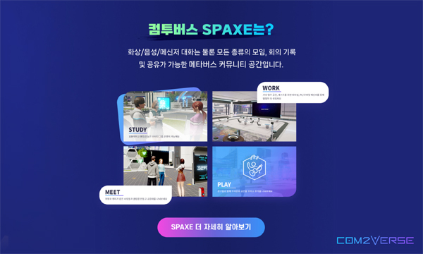 한편 컴투버스는 메타버스 업무 및 커뮤니티 허브가 될 스페이스의 기능을 지속적으로 강화하고 편의성을 확대해 나갈 계획이다. 오는 8월에는 커뮤니티 전용 메신저를 제공하며 9월에는 컨벤션 센터를 열고 이후 파트너사들의 개별 서비스 영역, 일반 이용자 대상의 본격적인 메타버스 서비스 등을 순차적으로 선보일 계획이다.