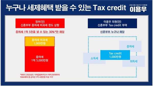 이유는 최근 정부가 신혼부부 결혼자금에 대한 증여세 비과세 한도를 1인당 5000만 원에서 1억5000만원으로 늘리는 세제 개편안을 발표하고 이에 대해 실물경제 전문가인 이용우 더불어민주당 국회의원(경기 고양시정)이 소수에게 특혜를 주는 신혼부부 증여세 비과세 혜택를 제공하기 보다는 청년 모두에게 돌아가는 청년 비과세 한도로의 전환을 촉구하고 나섰기 때문.