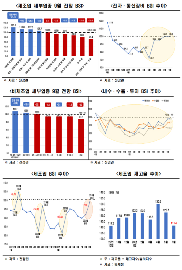 제조업 세부 산업 중에서는 4개 업종(▲식음료 및 담배(121.1), ▲일반·정밀기계 및 장비(113.3), ▲목재·가구 및 종이(112.5), ▲자동차 및 기타운송장비(106.7))이 호조 전망을 보였고, 반도체가 포함된 전자·통신장비는 기준선(100.0)에 걸쳤다. 전자·통신장비 BSI 지수값은 올해 5월(72.2)을 저점으로 추세적 반등이 나타나고 있다.