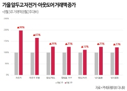 한편 가을을 앞두고 캠핑, 아웃도어 용품을 찾는 수요도 큰 폭으로 증가하고 있다. 같은 기간 자전거의 거래액은 전주 대비 98%가 증가했으며 자전거 부품 역시 65%가 올랐다.