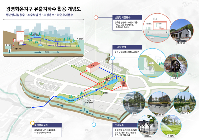 유출 지하수를 광명학온 공공주택지구 내 공공청사 등의 냉·난방에너지로 활용하고 사용된 지하수는 재생돼 소수력 발전과 공원 용수, 하천유지용수로 다시 활용되는 방식이다.