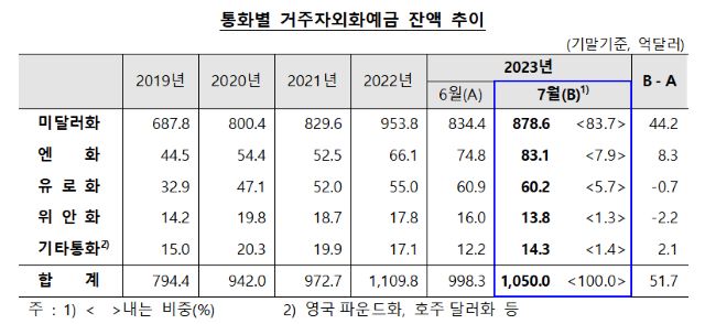 25일 한국은행이 발표한 ‘2023년 7월중 거주자외화예금 동향’에 따르면 기업의 해외조달자금 일시 예치 등으로 거주자외화예금이 전월말 대비 51억 7000만달러 증가했다.