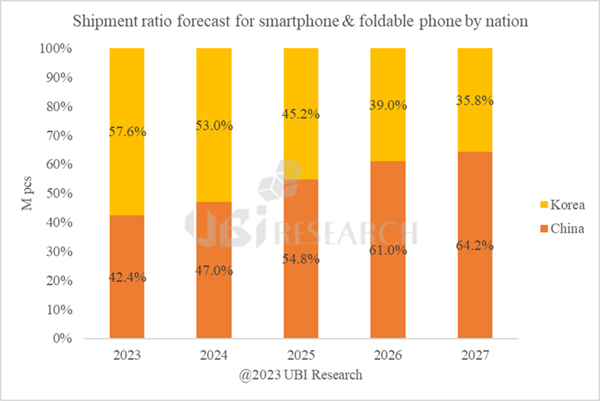 (서울=NSP통신) 이복현 기자 = 유비리서치가 발간한 3사분기 OLED 마켓트랙에 의하면, 중국의 스마트폰용(폴더블 폰 포함) OLED 출하량이 2025년에는 한국을 앞설 것으로 예상됐다.