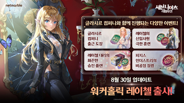 넷마블은 이번 업데이트를 기념해 ‘레이첼의 신입사원 극한 훈련’ 이벤트를 진행한다. 또 레이첼 대리의 화끈한 승진 플랜 이벤트도 진행한다. 이외 신규 마스터 시즌을 운영한다.