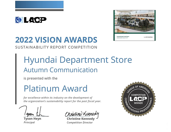 현대백화점은 자사 발간 지속가능경영보고서가 미국 커뮤니케이션 연맹(League of American Communications Professionals, LACP)이 주관하는 2022 비전 어워드에서 지속가능보고서(Sustainability Report) 부문에서 대상(플래티넘)을 수상했다고 밝혔다.