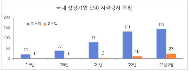 코스피 상장사 중 ESG 자율공시를 한 기업은 2020년 38개에서 2022년 131개, 2023년 143개로 꾸준히 늘고 있지만 여전히 절반 가까이 ESG공시를 미루고 있다.