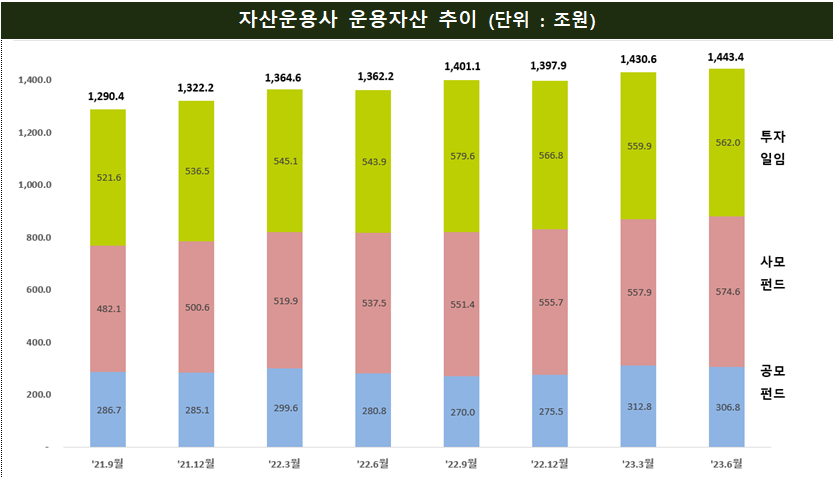 2023년 6월 말 자산운용사의 운용자산(펀드수탁고, 투자일임계약고 기준)은 1443조 4000억원으로 2023년 3월 말 1430조 6000억원 대비 12조 8000억원(0.9%) 증가했다. 펀드수탁고는 881조 4000억원으로 2023년 3월 말 대비 10조 7000억원(1.2%) 증가했는데 이 중 공모펀드는 306조 8000억원(34.8%)이고 사모펀드는 574조 6000억원(65.2%)이다. 투자일임계약고는 562조원으로 2023년 3월 말 대비 2조 1000억원(0.4%) 증가했다.